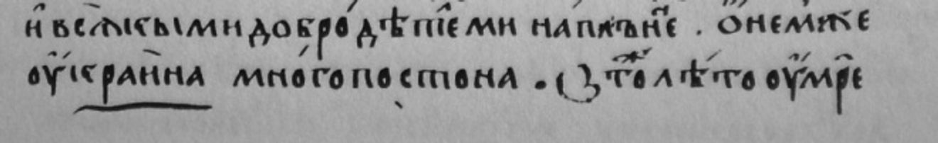 «плакашасѧ по немь вси Переӕславци . бѣ бо любѧ дроужиноу бѣ бо кнѧзь добръ . и крѣпокъ на рати . и моужьствомъ крѣпкомъ показаӕсѧ и всѧкими добродѣтелми наполненъ Ѡ нем же Оукраина много постона».