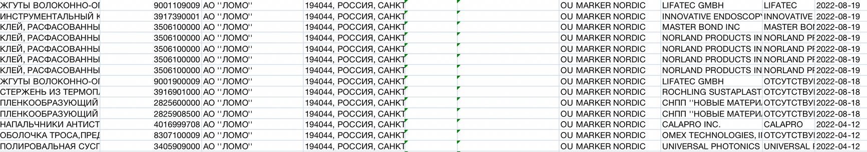 Поставщик «Ломо» из Европы — эстонская Marker Nordic Ou. Фирма из Таллина снабжала российского оборонного подрядчика волоконно-оптическими жгутами, промышленным клеем и др.