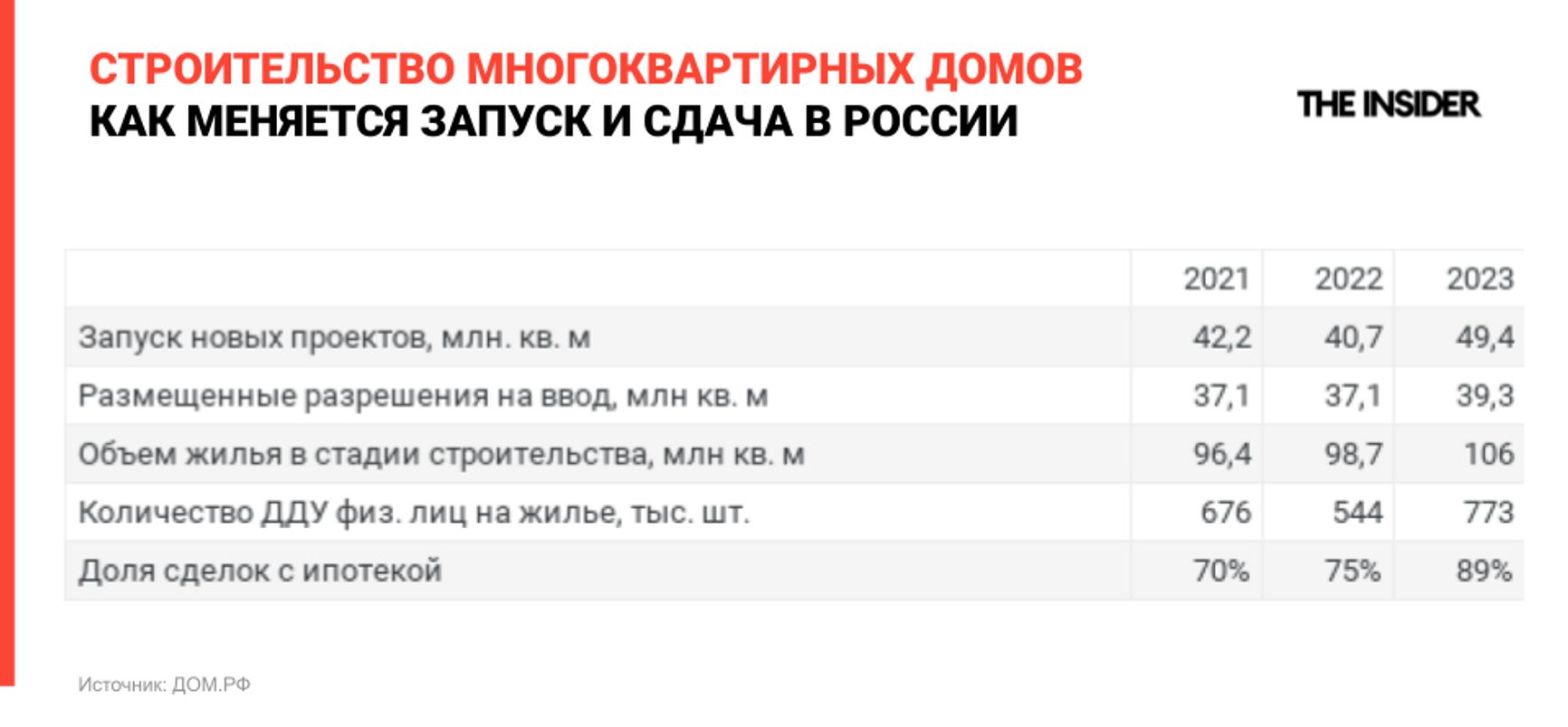 Ипотечное кредитование растет благодаря субсидиям государства. В сегменте многоквартирных домов другой ипотеки сейчас почти и нет — субсидируемая обеспечивает почти 95% общего объема. В 2023 году был поставлен рекорд по количеству проданных квартир в новостройках — 773 тысячи договоров долевого участия (ДДУ). Это на 42% больше, чем в 2022 году, и на 14% больше, чем в 2021 году, который раньше был лучшим. На ипотечные кредиты приходится 89% продаж, в том числе на ипотеку с государственной поддержкой — 83%.