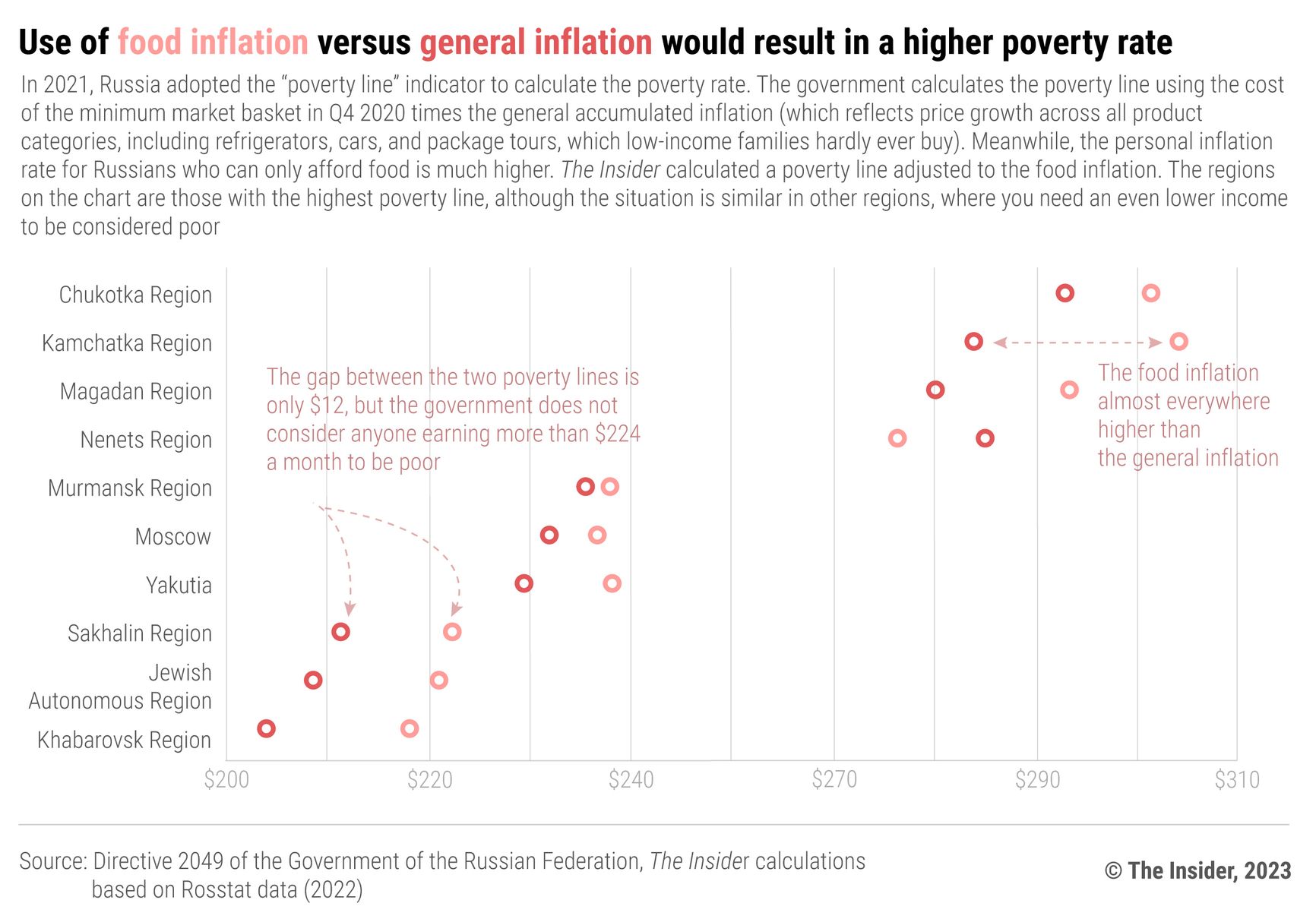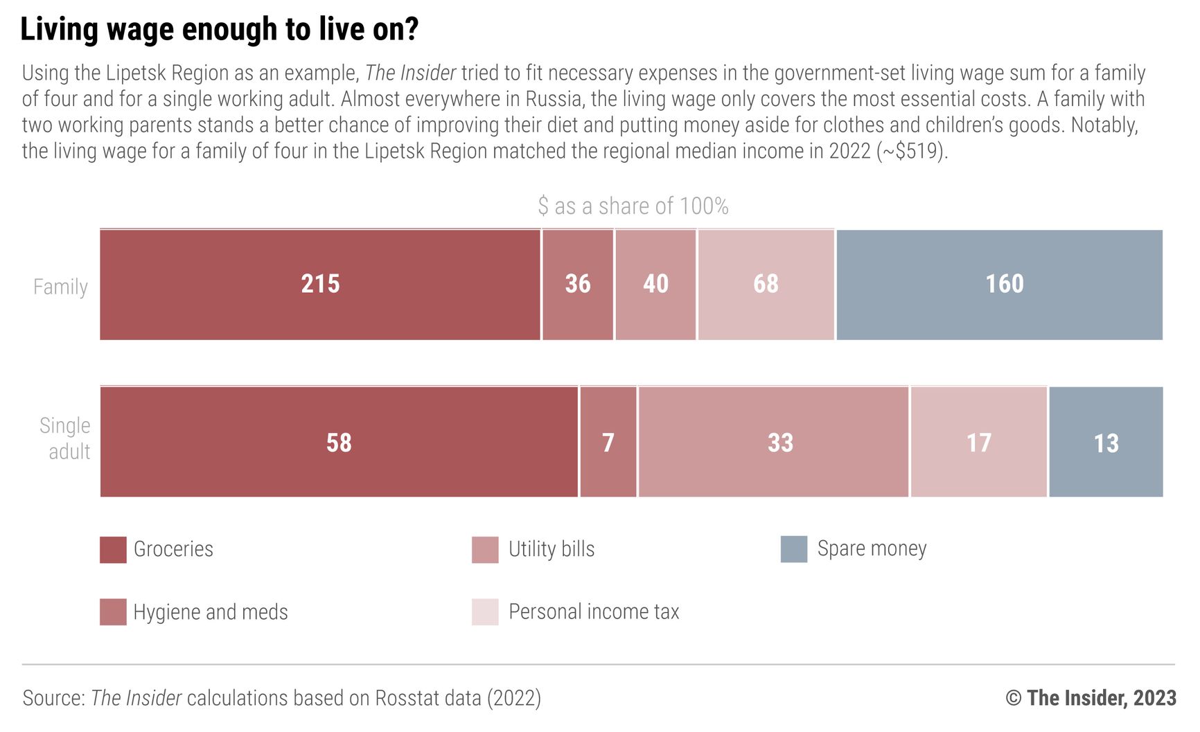 In the latter half of 2022, the living wage according to Rosstat’s new methodology reached the national average of ~$155, ranging from ~$130 in the Lipetsk Region to ~$350 in Chukotka. The minimum food basket in the Lipetsk Region (estimated under Rosstat’s earlier methodology) costs ~$60; another ~$33-40 would cover utility bills, and ~$11 is enough for basic hygiene needs. The remaining $20 or so covers the personal income tax (because the minimum living wage is a gross amount), and the surplus could be spent on transportation, for instance. With such an income, one can hardly save money for rent and emergency expenses, like dentistry, let alone clothes, a phone, or a computer. This is the definition of a hand-to-mouth existence when you can only afford food and the bare necessities you can’t forgo.