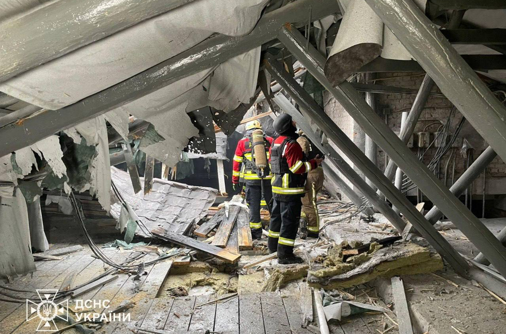 Ukraine’s State Emergency Service released footage of rescue workers and firefighters extinguishing the blaze on the roof of the building and confirmed that there were no casualties.