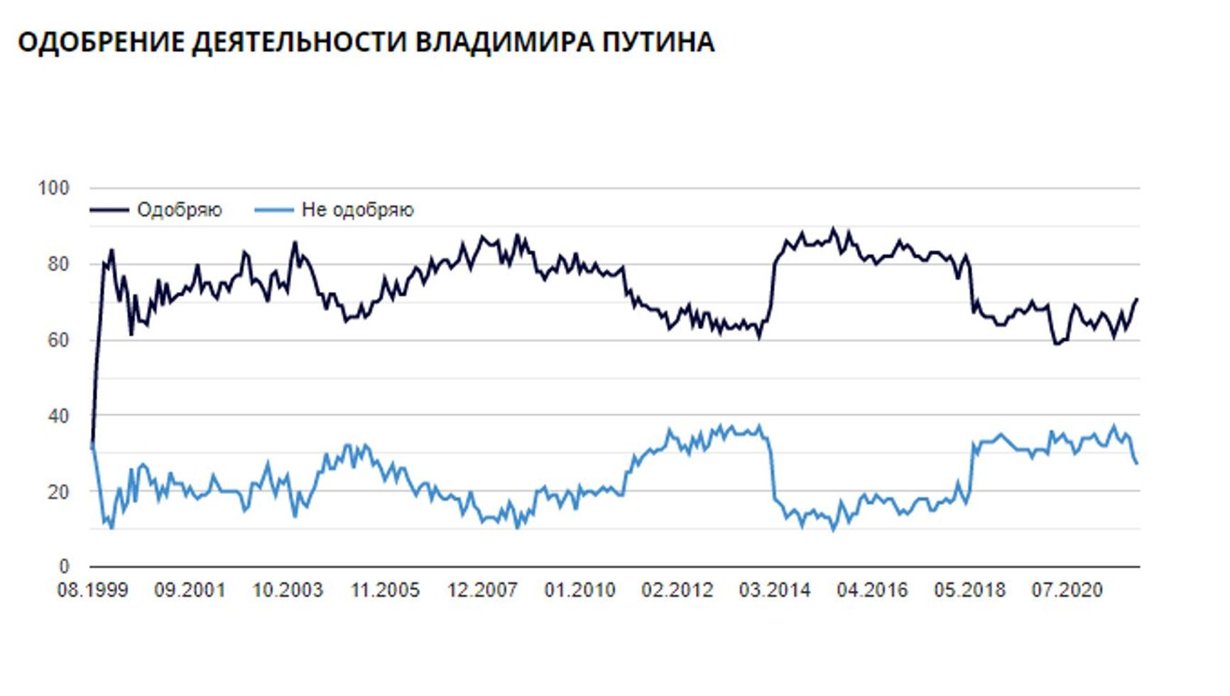 Vladimir Putin’s approval rating: I approve (dark blue) / I disapprove (light blue)
