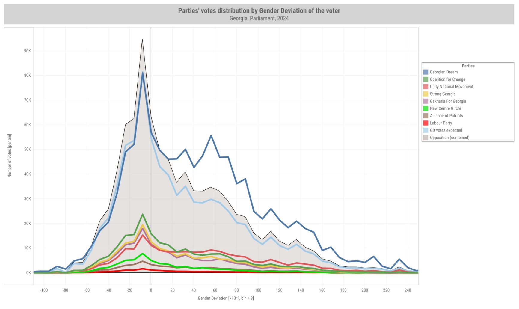 The graph shows that Georgian Dream owes its victory to the anomalously disproportionate male voting area. Meanwhile, the opposition parties are decisively leading in the area of conventional “gender-balanced”, or “heterosexual” voting.