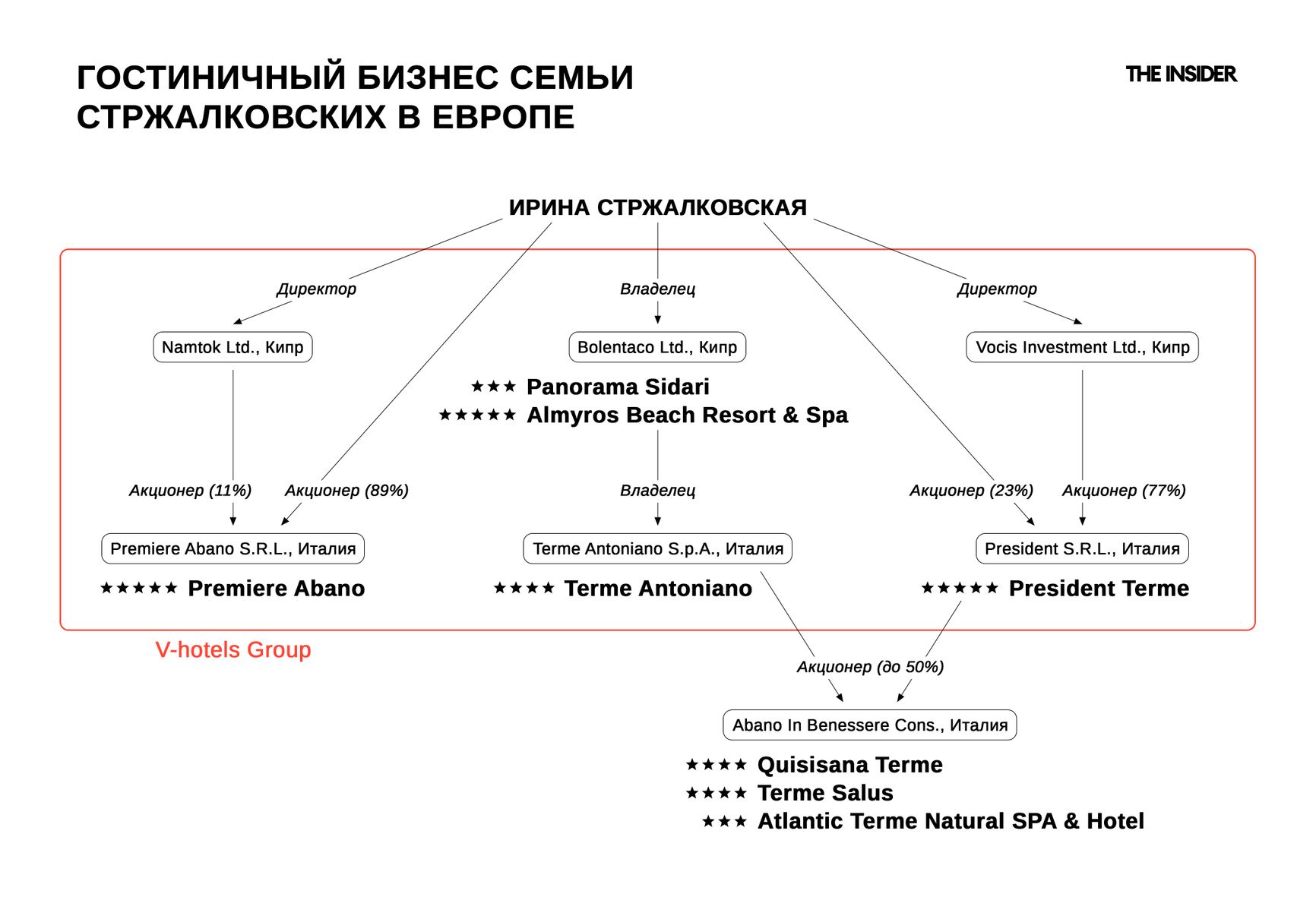 Публично V Hotels называют себя международной компанией, акционерами которой являются русские, греки, болгары, киприоты, швейцарцы и итальянцы. Но на практике собственником отелей группы является Ирина Стржалковская. Например, в Premiere Abano S.R.L. Стржалковской напрямую принадлежит 89%, а еще 11% она владеет через кипрскую компанию Namtok Limited. В President S.R.L. Ирина владеет 23% напрямую, а остальные 77% принадлежат ей еще через одну кипрскую фирму, Vocis Investments Limited.