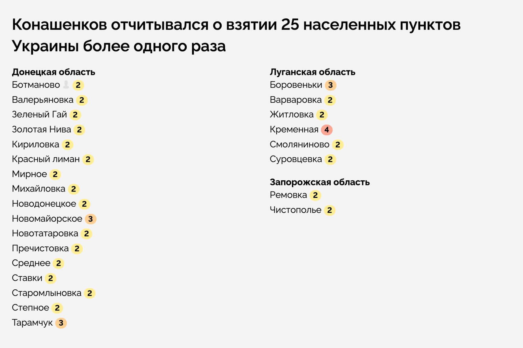 Кроме того, Конашенков несколько раз отчитывался об «установлении контроля» над одними и теми же городами, не менее 25 населенных пунктов были взяты больше одного раза.