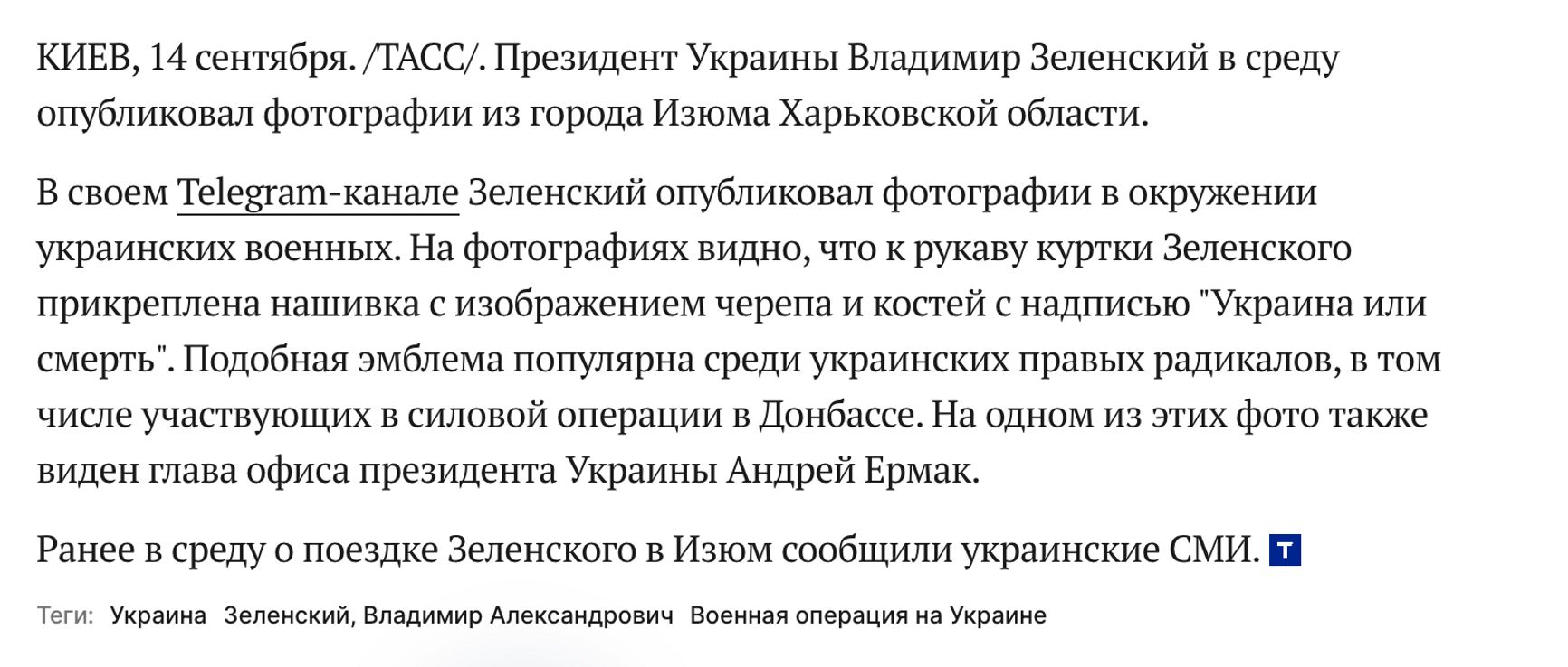 Президент Украины Владимир Зеленский 14 сентября посетил освобожденный от российской оккупации Изюм в Харьковской области. Однако пропагандистские российские агентства, в том числе РИА «Новости» и ТАСС, при освещении события не упомянули, что город деоккупирован от российской армии, зато детально рассмотрели нашивки на рукаве Зеленского и на форме украинского военного.