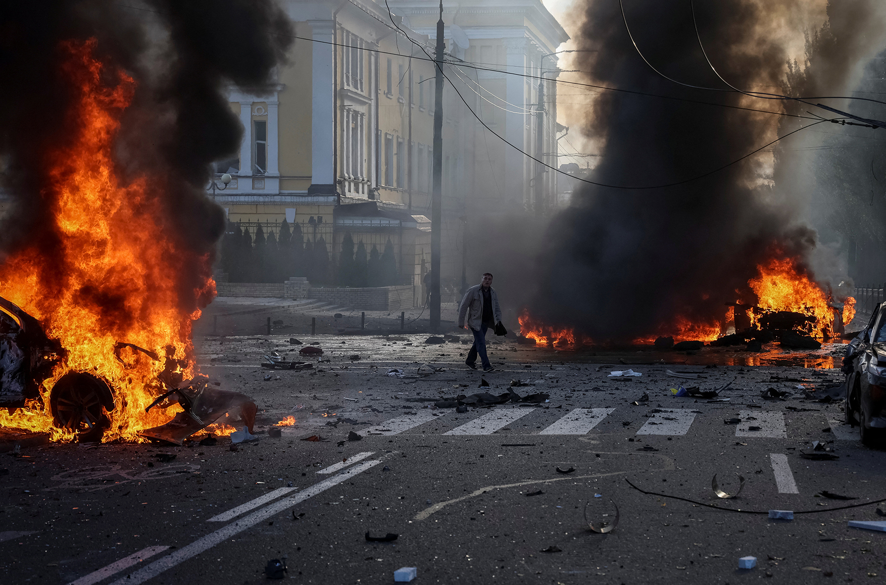 Утром 10 октября Россия обстреляла территорию Украины. Атаки были нацелены на разные города, в том числе на Киев. Было выпущено 83 ракеты, 43 из них сбиты средствами ПВО. Государственная служба Украины по чрезвычайным ситуациям сообщила, что в результате ударов погибли 14 человек, еще 97 пострадали. Больше 1,3 тысячи населенных пунктов остаются обесточенными, больше всего — в Сумской (766), Львовской (353) и Тернопольской (169) областях. Президент России Владимир Путин назвал удары ответом на подрыв Крымского моста, а также заявил, что Россия бьет «по объектам энергетики, военного управления и связи». Такой же позиции придерживаются российские пропагандисты и чиновники. Они открыто выражают радость и даже записывают видео с танцами в честь этих атак, несмотря на гибель людей. При этом они используют одинаковые, будто прописанные в методичке фразы: «красные линии», «теракт», «ответный удар».