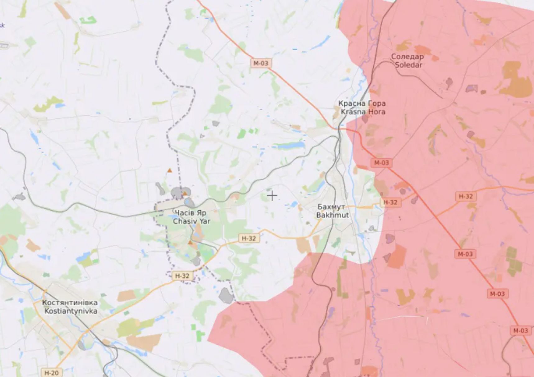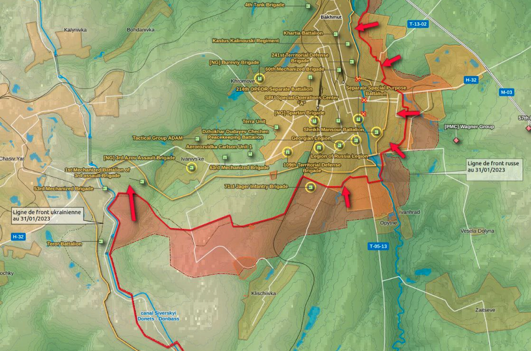 «M03 и H32 — две основные дороги в город [Бахмут] для украинских защитников — сейчас, предположительно, находятся под угрозой прямого огня после наступления России. <…> Военизированные формирования Вагнера, скорее всего, захватили второстепенную дорогу, соединяющую Бахмут с городом Северск. В то время как многочисленные альтернативные маршруты поставок через проселочные дороги остаются доступными для украинских сил, Бахмут становится всё более изолированным», — говорится в сводке британской разведки от 5 февраля.
