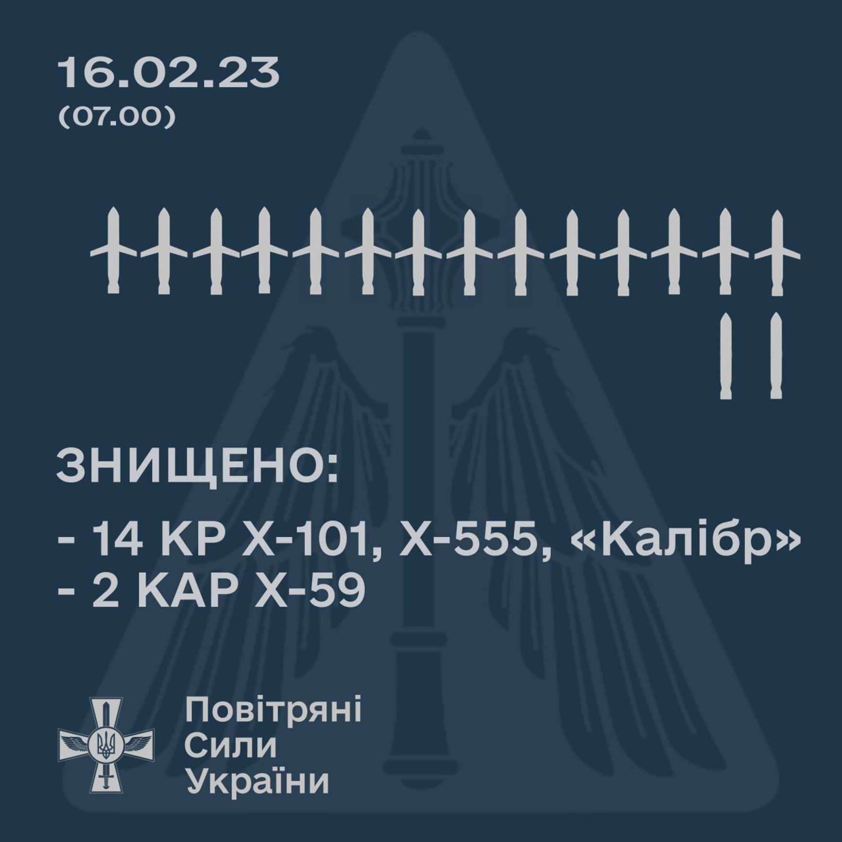 По данным Генштаба ВСУ, Россия при ударе в ночь на 16 февраля применила 20 крылатых ракет (Х-101, Х-555, «Калибр»), 12 ракет Х-22, а также две авиационные ракеты Х-59. Силы ПВО сбили 14 крылатых ракет и две авиационные, отмечает Генштаб.
