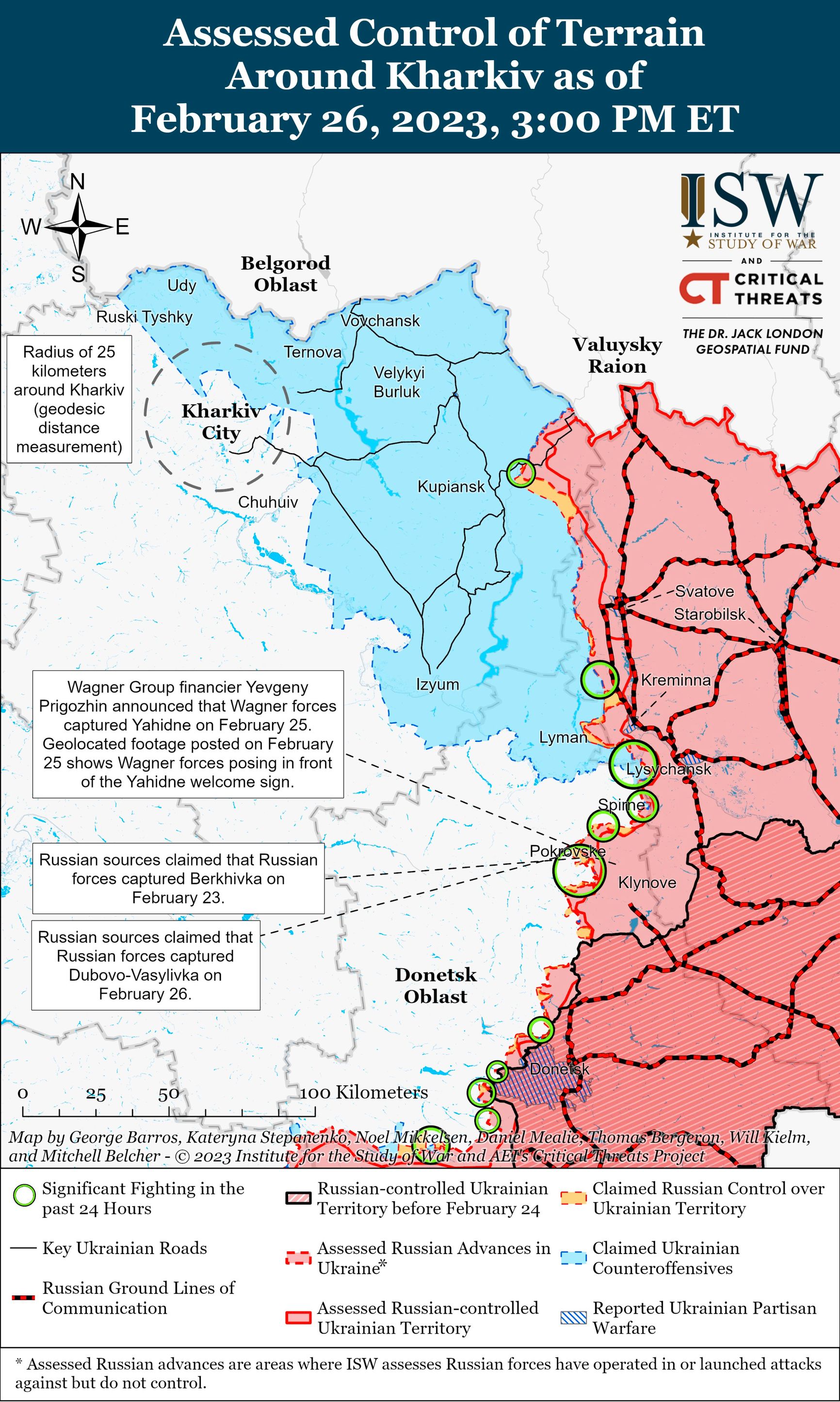 Само Ягодное, судя по всему, захватили бойцы ЧВК Вагнера. В Telegram-канале «Оркестр Вагнера» опубликовали фото с бойцами на входе в поселок и подписали, что оно сделано в 19:00 25 февраля.