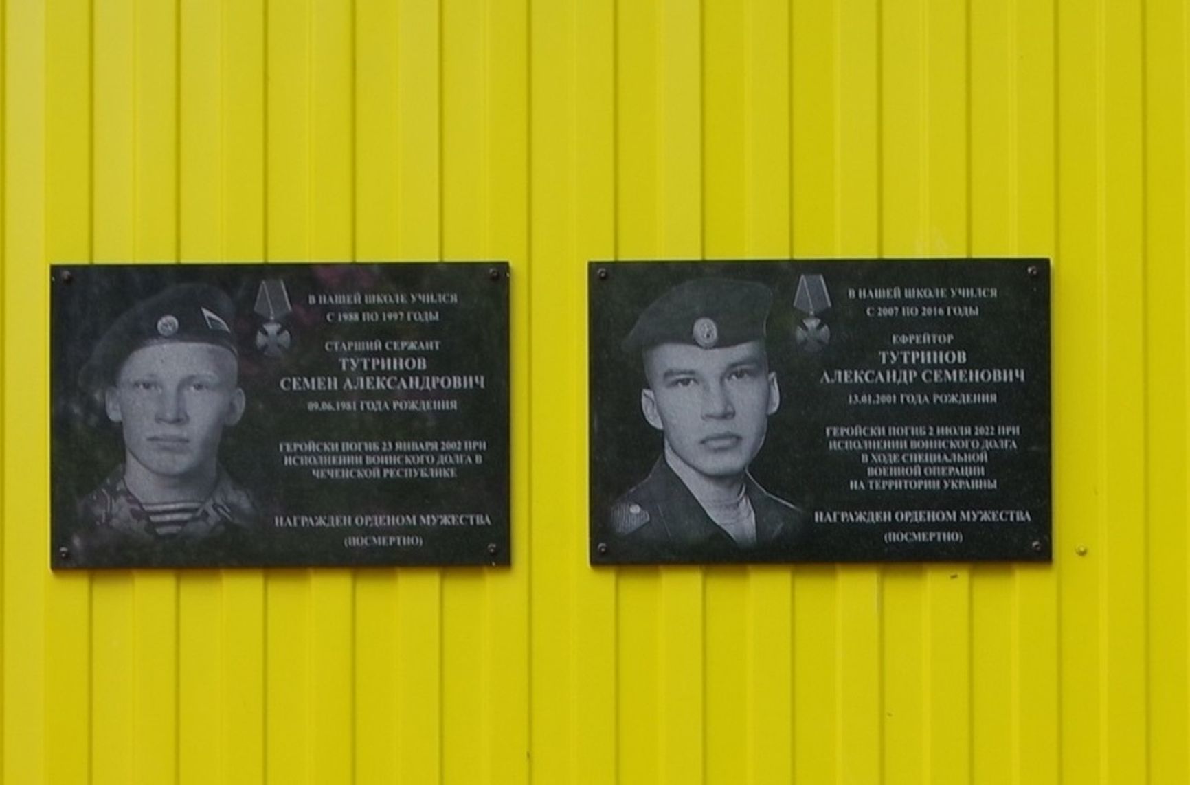 Примечательная новость из села Куратово в Республике Коми. На стену здания местной школы помещены памятные таблички в память об отце и сыне Тутриновых. Они погибли на двух войнах, развязанных Россией. Семен Тутринов погиб в Чечне в 2002 году, а его сын Александр Тутринов, родившийся за год до смерти отца, — в 2022 в Украине. Оба награждены орденами Мужества посмертно и учились в этой школе.