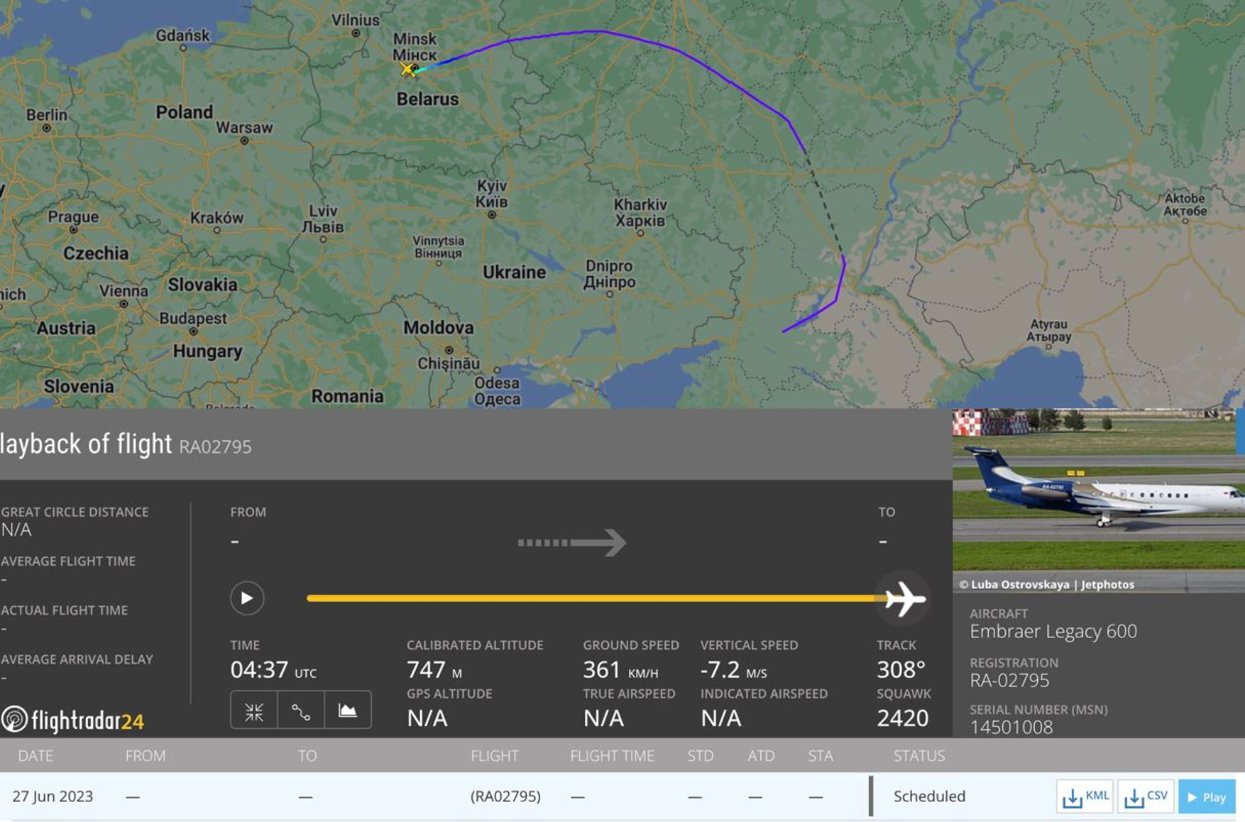 Самолет с регистрационным номером RA-02795 приземлился на военном аэродроме Мачулищи в 07.40 по местному времени (совпадает с московским). На это обратил внимание проект «Беларускі Гаюн», который занимается мониторингом военной активности в Беларуси.