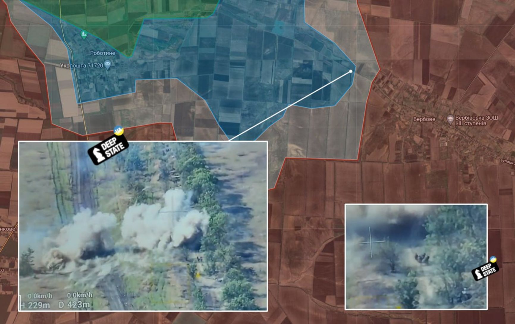 Украинский OSINT-ресурс DeepState геолоцировал успешный артиллерийский удар по российской колонне с подкреплением южнее Вербового и огонь по группе ВСУ всего в 700 метрах от самого села.