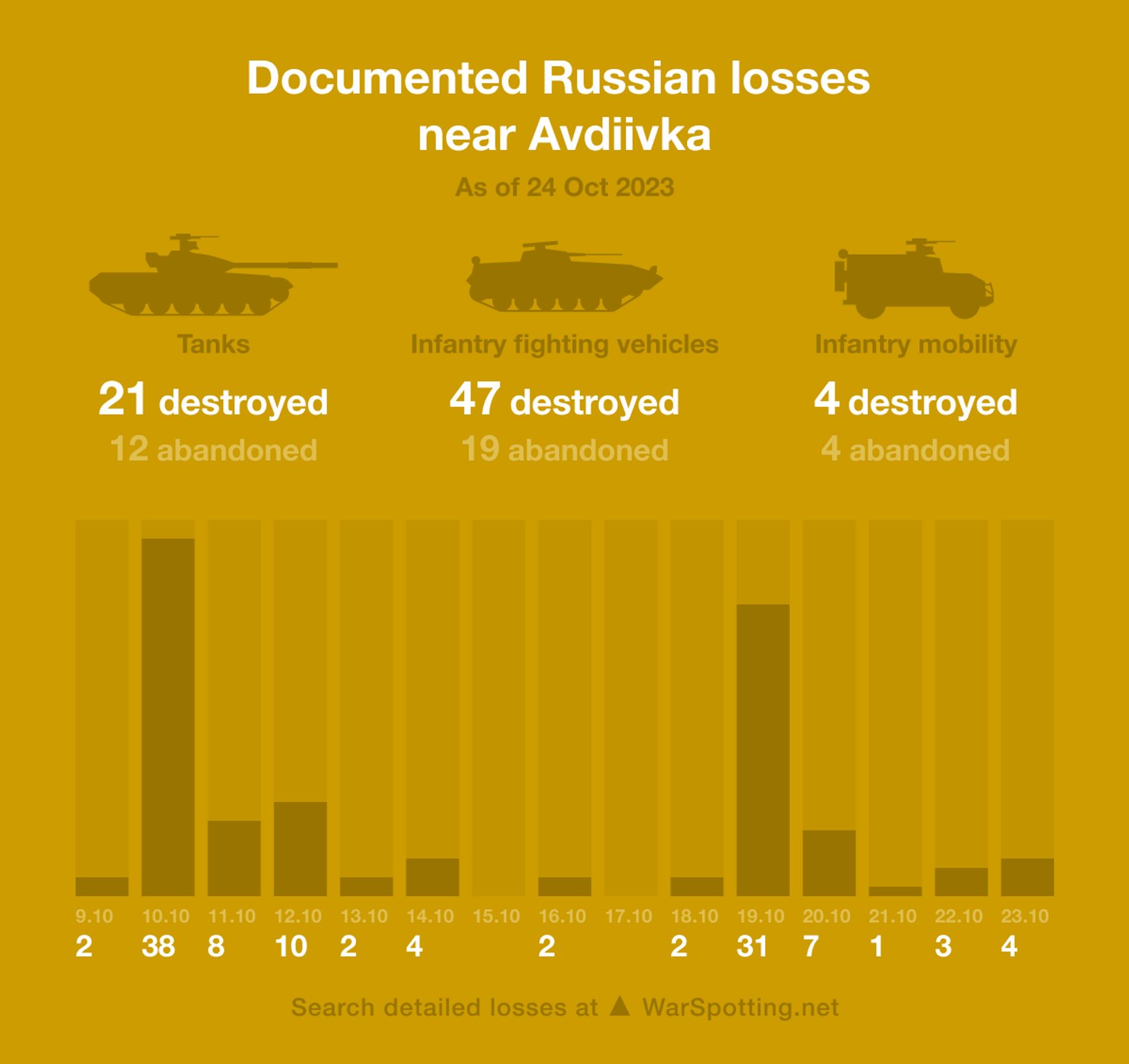 OSINT-ресурс «Військовий Віщун» на основе спутниковых снимков дает оценку потерь с российской стороны под Авдеевкой как минимум в 150 единиц и приходит к выводу, что визуальные свидетельства покрывают только 30–40% от реального количества поврежденной и уничтоженной техники.