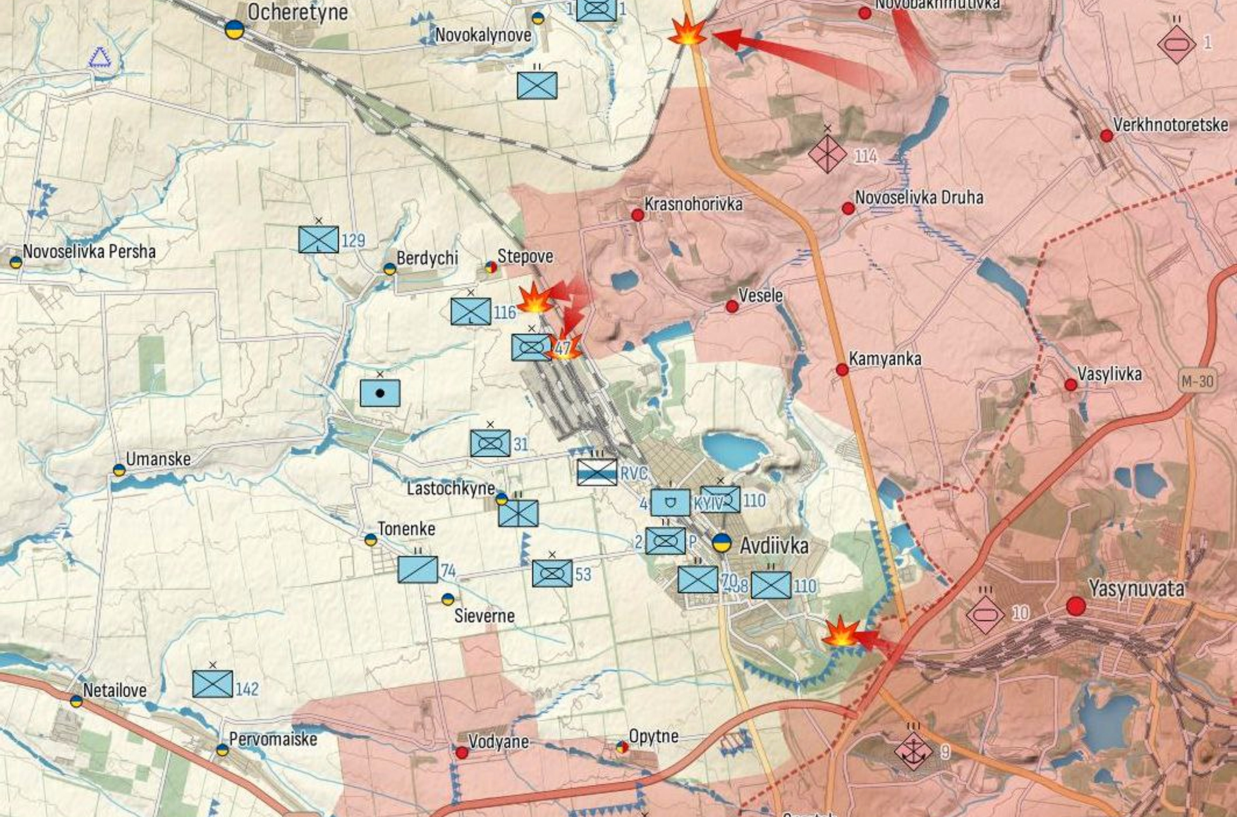 DeepState пишет, что российские военные атакуют не только с флангов, но и пытаются выйти к Авдеевке в лоб, возле станции «Ясиноватая-2», где идут тяжелые бои. В ходе штурмов применяют танки, БМП и пехоту. Потеря промзоны рядом со станцией, которая и так сильно разрушена российской артиллерией, как уверены в DeepState, — вопрос времени. Авторы ресурса демонстрируют видео (1, 2) отражения атак ВС РФ в районе АКХЗ.