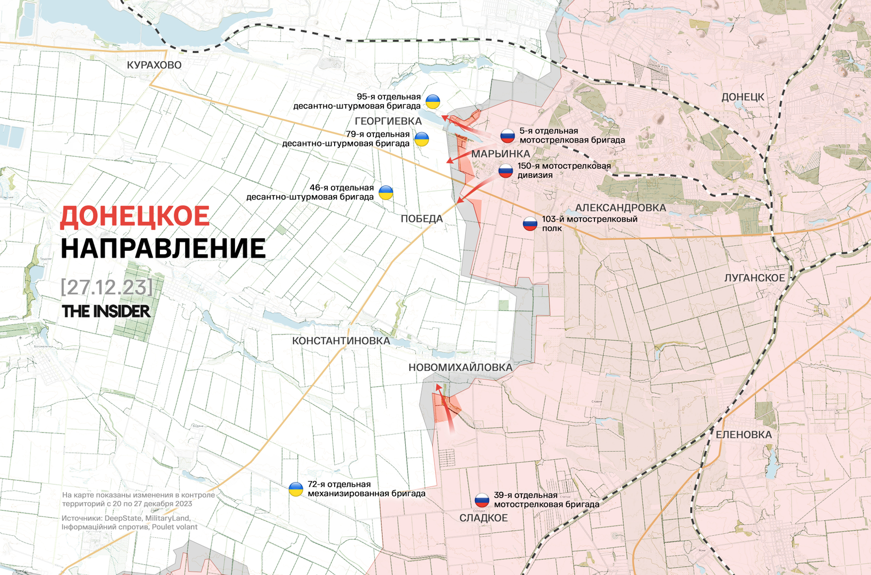ВС РФ ведут наступательные действия и на авдеевском направлении в районе Степового, но пока безуспешно. Продолжаются бои у села Первомайское в Донецкой области. Россияне контролируют руины Марьинки, а украинские подразделения выстраивают новую полосу обороны на окраинах и за пределами города.