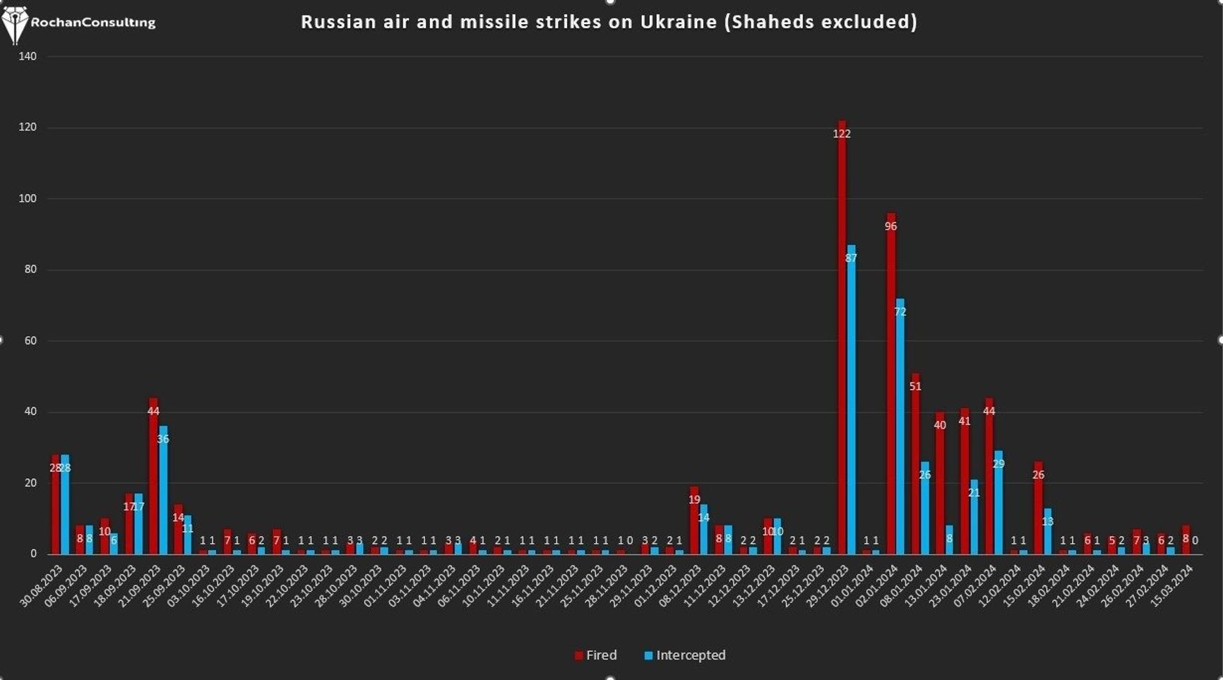 По данным Воздушных сил Украины, россияне выпустили по Киеву две ракеты «Кинжал», а также 29 крылатых ракет Х-101/Х-555. Крылатые ракеты были запущены стратегическими бомбардировщиками Ту-95МС. Утверждается, что силы ПВО сбили все ракеты.