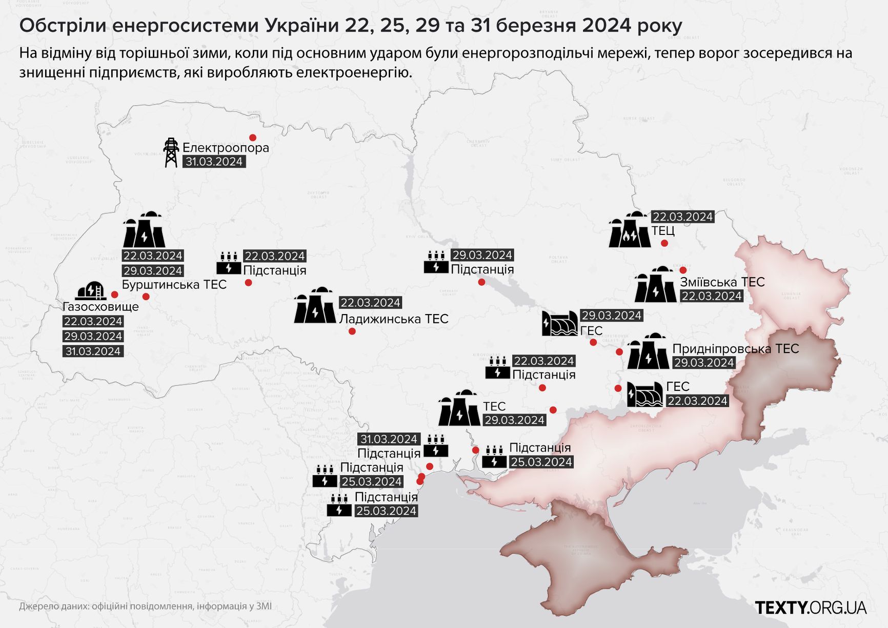 Во второй половине марта началась серия массированных обстрелов украинской энергетики. Издание Texty.org.ua визуализировало данные об объектах атак и пришло к логичному выводу, что ВС РФ делают всё возможное, чтобы осложнить Киеву следующий отопительный сезон.