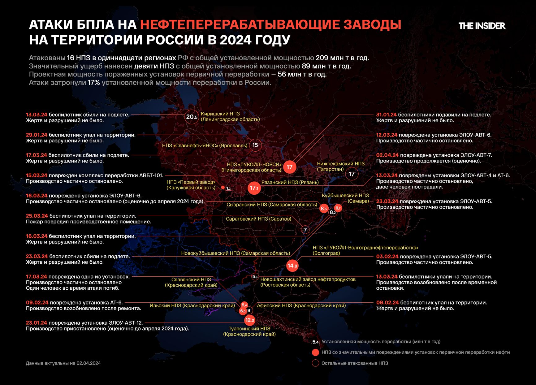 По подсчетам The Insider, в 2024 году состоялось 19 атак беспилотников на 16 нефтеперерабатывающих заводов в 11 регионах РФ. Общая установленная мощность атакованных заводов — 209 млн т в год, но значительные повреждения получили только девять НПЗ совокупной установленной мощностью 89 млн т в год.