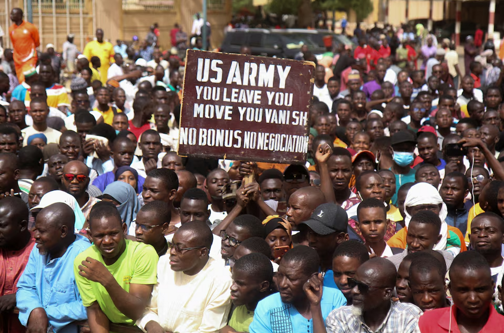Военные, захватившие власть в стране, потребовали от Вашингтона вывести из Нигера военный контингент почти в 1 000 человек. По словам источника Reuters, речь идет об авиабазе 101, находящейся рядом с международным аэропортом Диори Хамани в Ниамее, столице Нигера, — российские солдаты находятся в отдельном ангаре, столкновений между ними и американцами не было. Тот же источник назвал ситуацию «не очень хорошей, но в краткосрочной перспективе управляемой».
