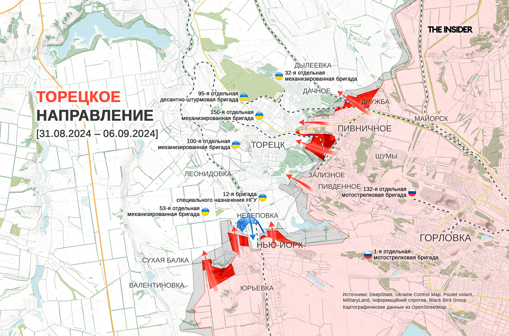 DeepState отмечает, что украинские военные смогли отбить некоторые позиции около Нью-Йорка (в 1951–2021 годах — Новгородское) и Нелеповки на торецком направлении. ВС РФ сумели продвинуться вблизи Горняка, а также в Лысовке и Галицыновке на покровском направлении.
