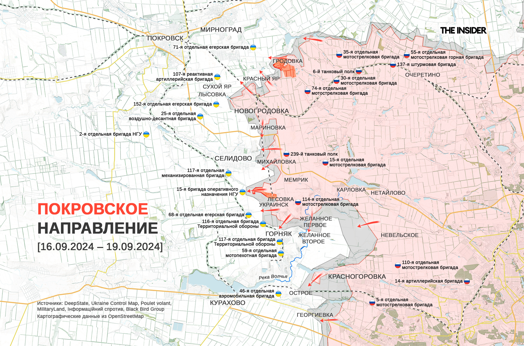 «Военкор» Юрий Котенок сообщает, что на покровском направлении ВС РФ, «развивая успех после взятия Украинска», удалось «зацепиться» за северную окраину Горняка. Минобороны РФ, в свою очередь, отчиталось о захвате населенного пункта Георгиевка к северо-западу от Марьинки.