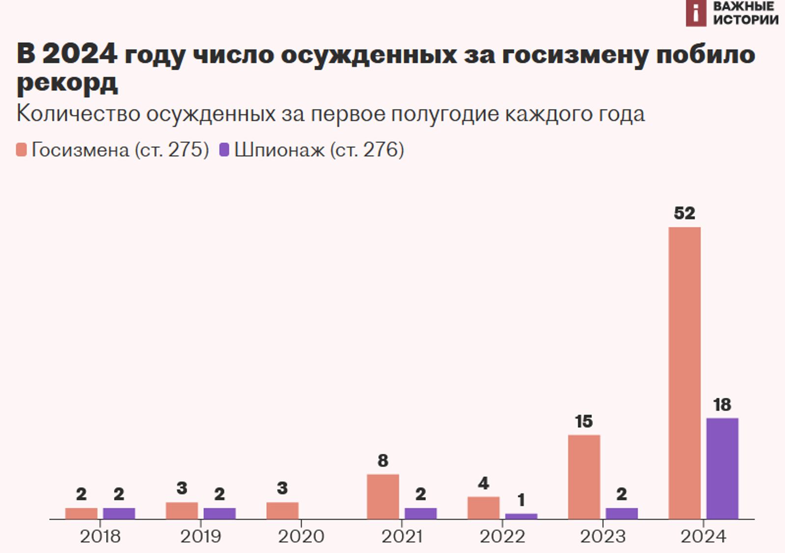 За первые шесть месяцев 2024 года российские суды осудили за госизмену 52 человека, следует из данных, опубликованных судебным департаментом при Верховном суде России. Как пишут «Важные истории», это в 3,5 раза больше, чем за аналогичный период предыдущего года. За весь прошлый год по статье «госизмена» осудили 39 человек.