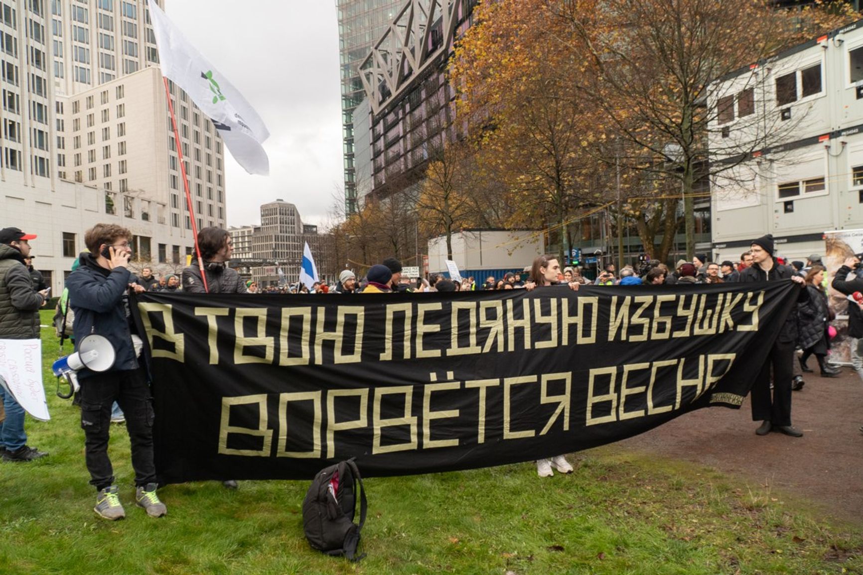 2000 человек — не бог весть какая цифра, но нужно понимать, что это — некий костяк, на который потом, возможно, нарастет «мясо» — и две тысячи превратятся, допустим, в 20 тысяч. Вопрос с флагом, который поначалу вызвал скандал (в анонсе марша первоначально был изображен российский триколор, что сразу вызвало отторжение и раздражение многих потенциальных участников), на месте как-то сам собой решился в пользу доминирующего бело-сине-белого. Эти флаги в парке у Потсдамер-плац развевались на некотором возвышении, отчего в голове сразу возникала не самая, возможно, удачная ассоциация с Бородинским или каким еще древним сражением.