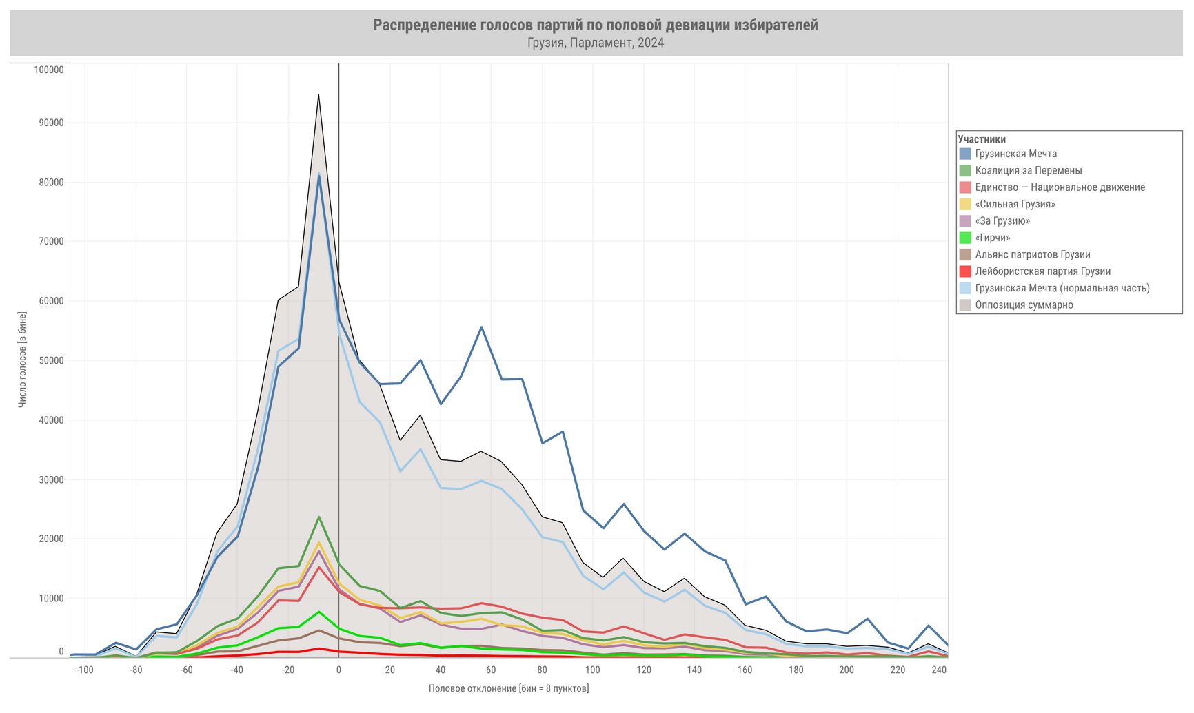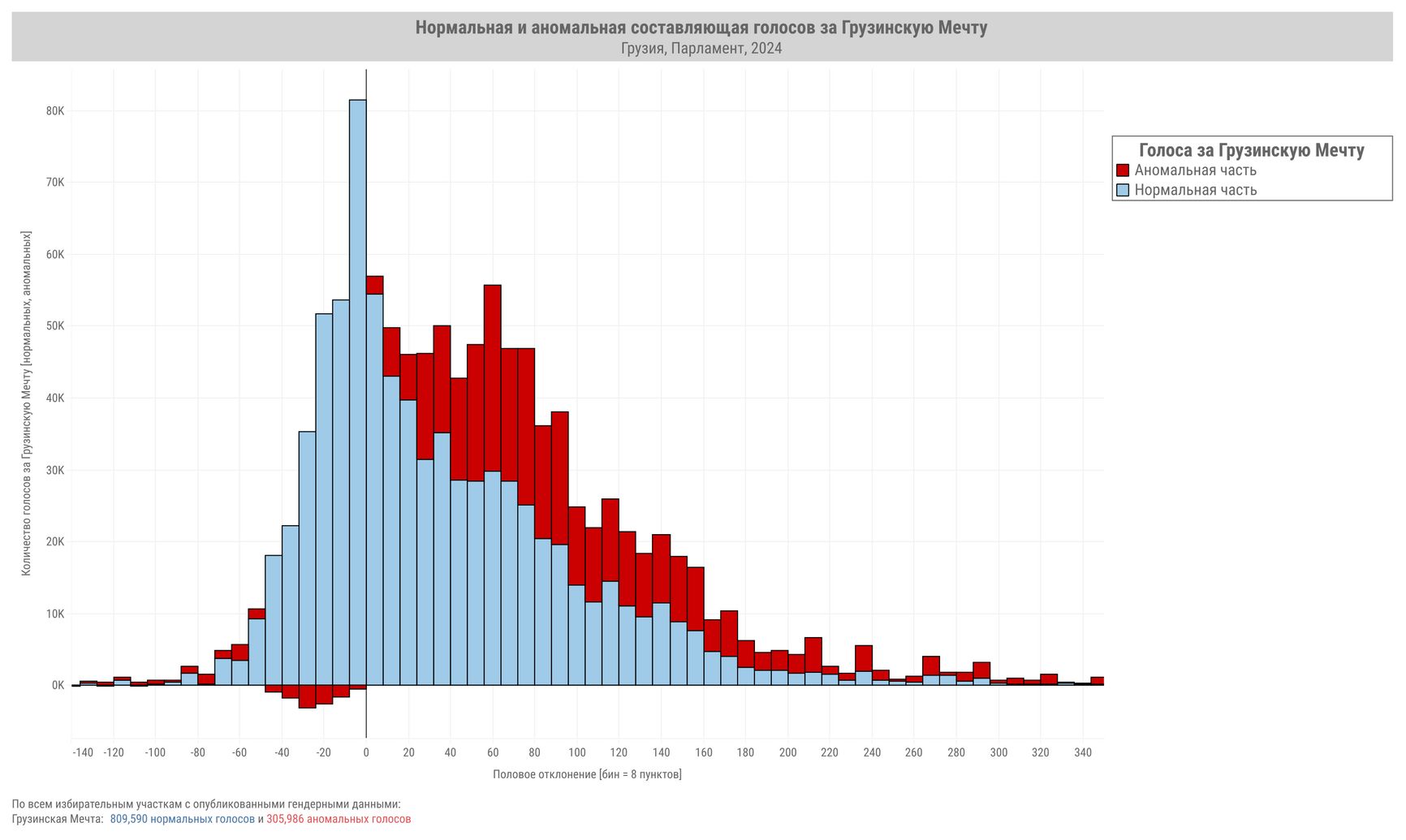 По горизонтальной оси отложена переменная «половое отклонение», она разделена на бины по 8 пунктов, по вертикальной — количество голосов за «Грузинскую мечту» в бине. Синие — «нормальные», красные — «аномальные» голоса.