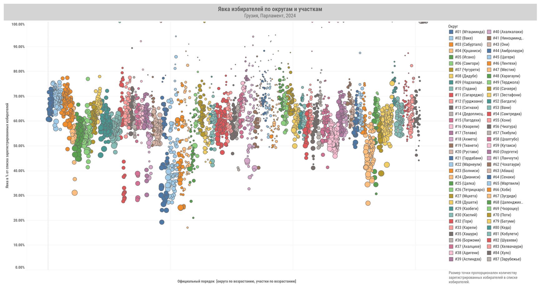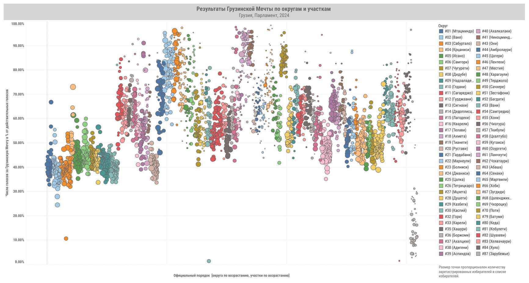 По горизонтальной оси отложены номера окружных избиркомов и избирательных участков по возрастанию, по вертикальной — результаты «Грузинской мечты» (верхний график), явка (нижний график).